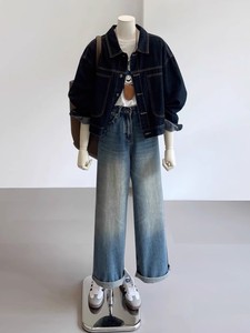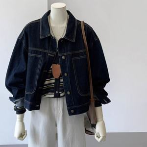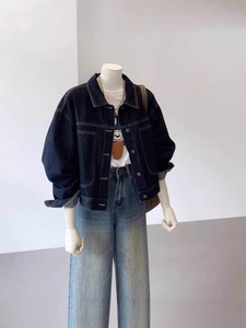 春秋新款深蓝色短款牛仔外套女韩版休闲口袋设计感工装风显瘦上衣