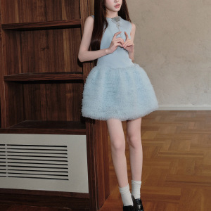 2025夏无袖拼接蛋糕裙气质圆领网纱蓬蓬裙a字裙短裙女夏2115