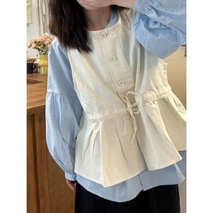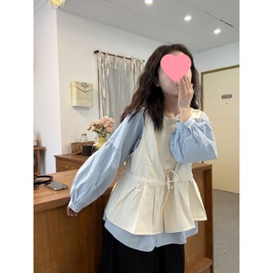 宽松百搭圆领长袖衬衫叠穿绑带马甲套装春季新款时尚两件套女