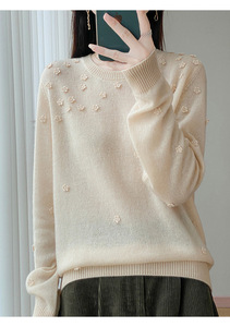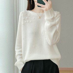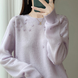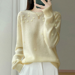 2025秋冬新款100%纯羊毛针织衫女宽松圆领全身绣花长袖羊绒打底衫