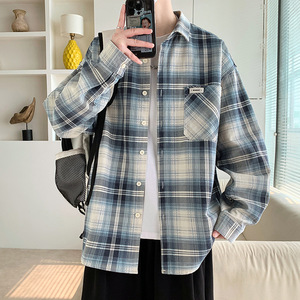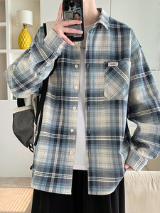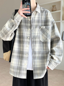 春秋季格子衬衫外套男生青少年纯棉上衣大码男装宽松休闲长袖衬衣