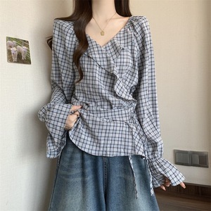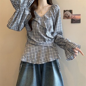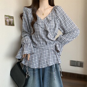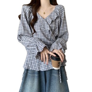 韩版简约通勤格子衬衫宽松长袖系带圆领时尚新款遮肚子上衣