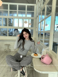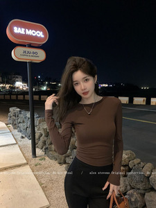 甜妹韩气修身长袖T恤女2025初秋新款掐腰短款显瘦纯色女装ins上衣
