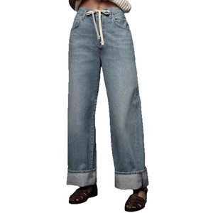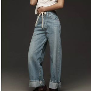 2025跨境阔腿女士牛仔裤长裤高腰外贸休闲宽松女百搭式抽绳浅蓝色