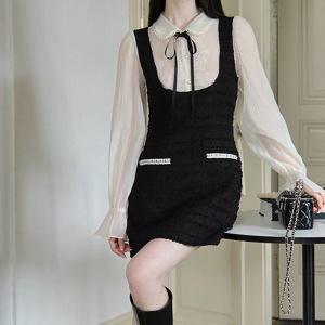 且长欢 "高智大女主"法式撞色小香风假两件连衣裙女修身收腰显瘦