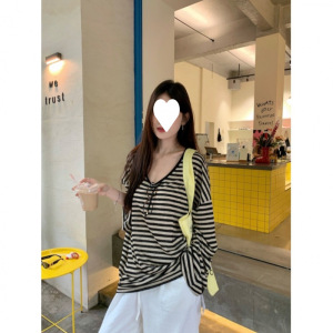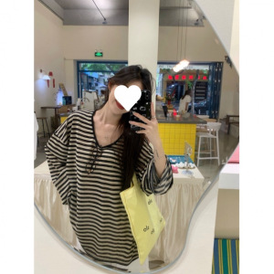 工厂批发【天丝羊绒】慵懒复古拼色条纹长袖T恤女夏季宽松中长款