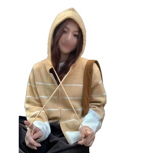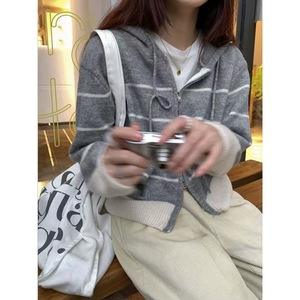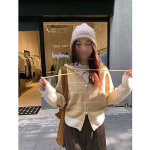 韩版条纹连帽毛衣女秋冬季软糯高级感慵懒风双头拉链针织开衫上衣