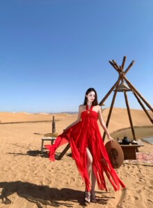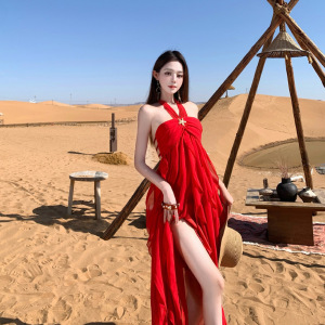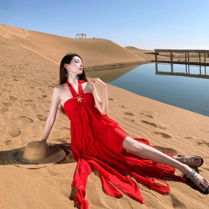 沙漠草原氛围感穿搭飘逸红裙新疆不规则抹胸挂脖连衣裙海边度假风