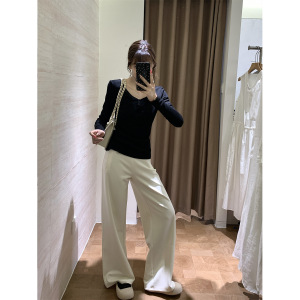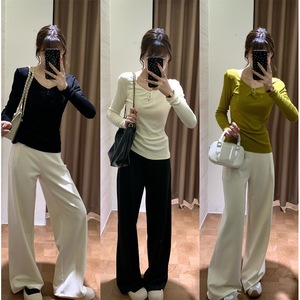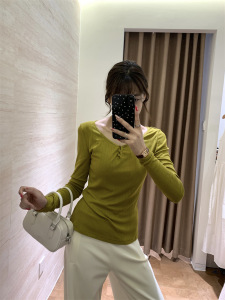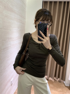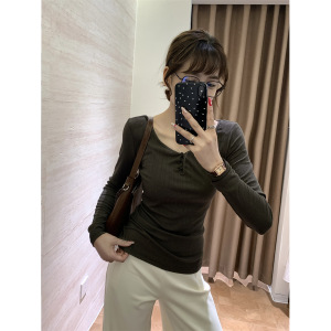设计感!纸片人穿搭大圆领纽扣修身正肩弹力长袖纯色针织打底T恤女
