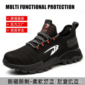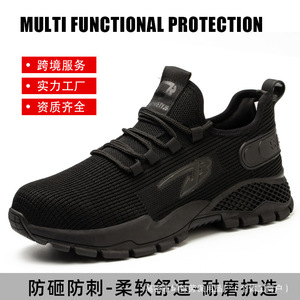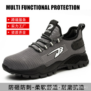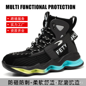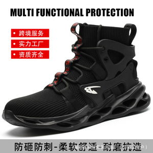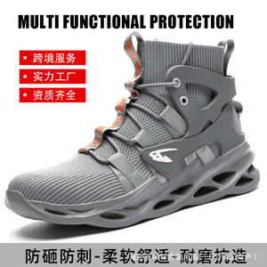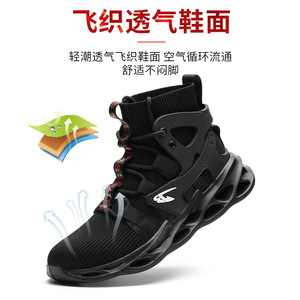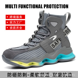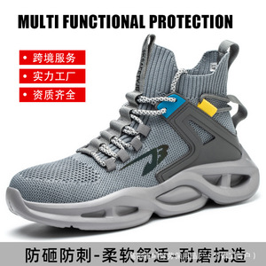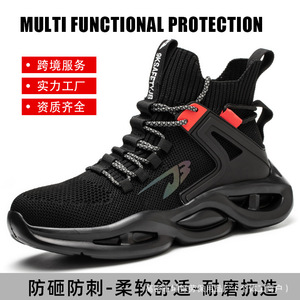 跨境批发高帮耐磨劳保鞋防砸防刺穿 飞织透气男士工作鞋柔软耐折