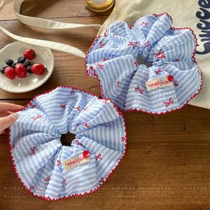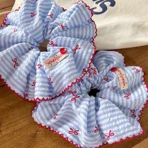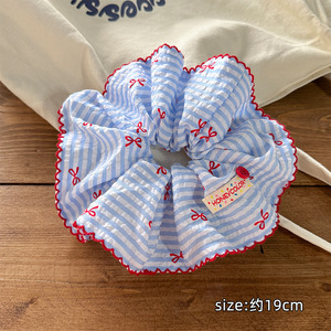 韩系蓝色条纹蝴蝶结纽扣大肠发圈女超大号扎头发绳低马尾头绳发饰