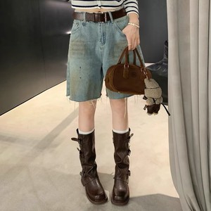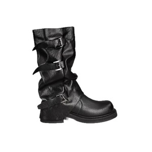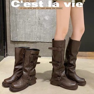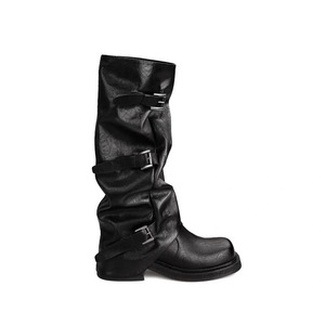 牛皮版~内增高时髦增高厚底短靴皮带扣方圆头褶皱中筒骑士靴女秋