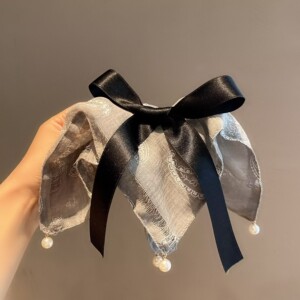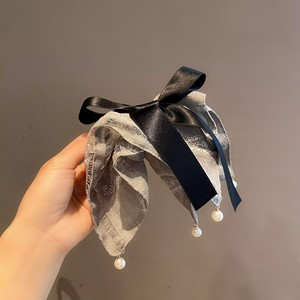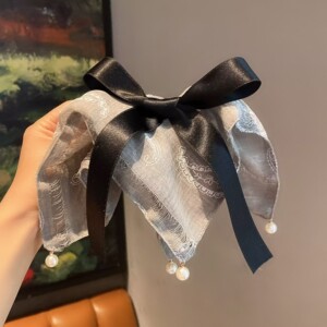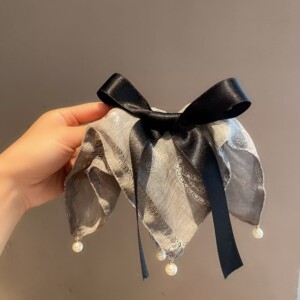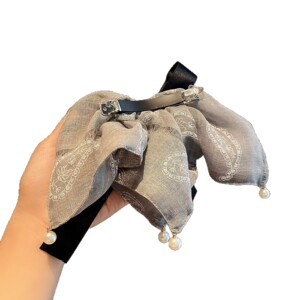 高级感亚麻灰色印花蝴蝶结弹夹女时尚气质珍珠后脑勺发卡新款发饰