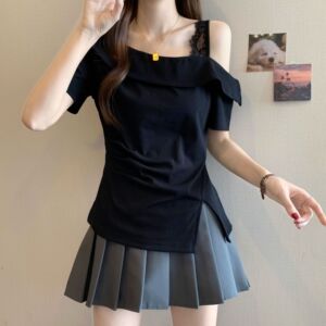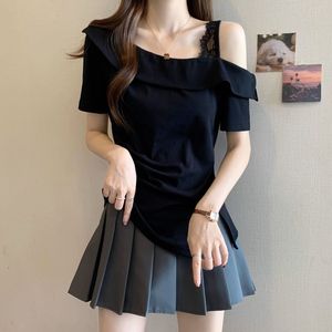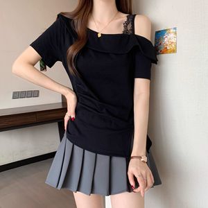 大码蕾丝拼接斜领不规则短袖t恤女夏季新款胖mm修身显瘦开衩上衣