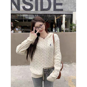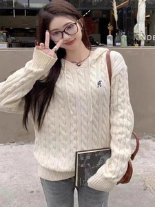 麻花套头连帽针织衫毛衣女灰色时尚宽松慵懒风小香风外套刺绣上衣