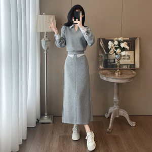 2025秋季通勤风时尚套装女装韩版气质灰色假两件上衣半身裙两件套