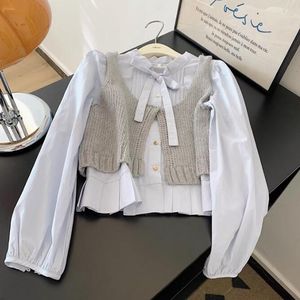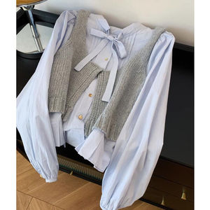叠上衣蝴蝶结短款好看独特超两件套女装小个子衬衫穿马甲蓝色漂亮