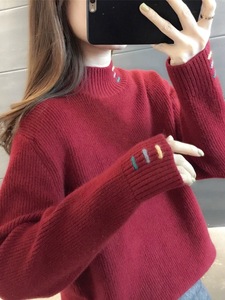 半高领毛衣女秋冬2025年新款秋冬季韩版慵懒风纯色绣花针织打底衫