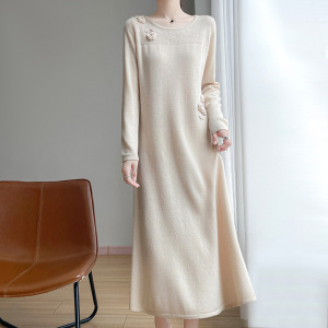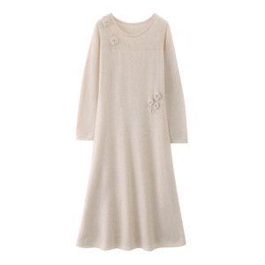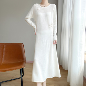 100丝光羊毛打底连衣裙女式圆领钩花长裙子气质优雅风保暖内搭潮