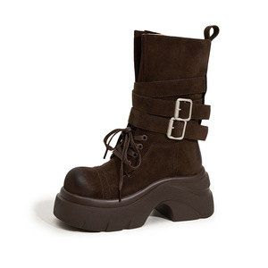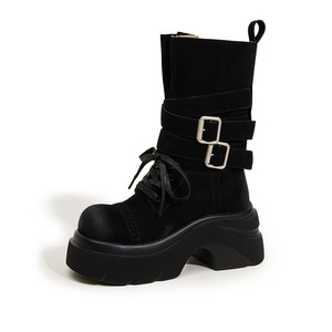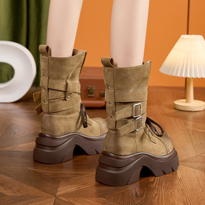 厚底内增高中筒靴女2025秋冬新款复古西部牛仔靴子粗跟百搭骑士靴