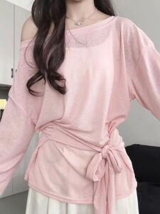 粉色绑带慵懒罩衫女夏季新款宽松T恤薄款设计感微透防晒外穿上衣