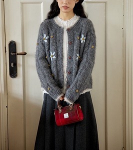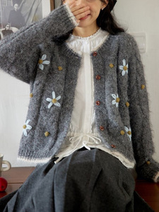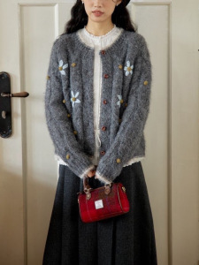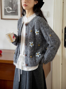 2025新款针织开衫女韩系秋冬温柔风宽松显瘦手工缝制花朵毛衣外套