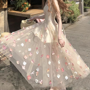 “莫奈花园”法式温柔浪漫立体花朵时尚气质吊带连衣裙