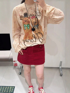 现货 2025早秋新款卡通小熊圆领碎花长袖T恤宽松休闲上衣女