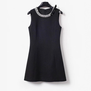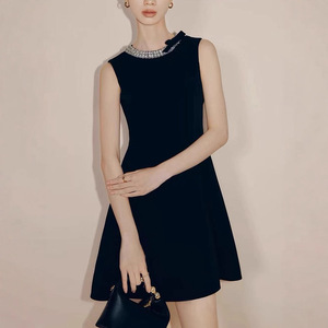 2025夏法式重工蝴蝶结轻奢钉钻黑色轻薄花呢小香风收腰连衣裙2117