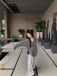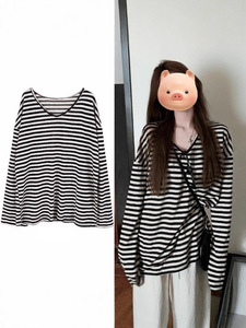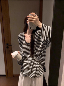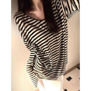 慵懒风复古撞色条纹长袖T恤女2025秋季新款软糯宽松显瘦中长上衣