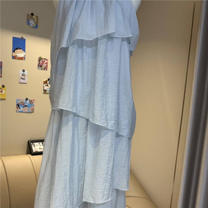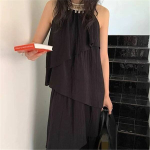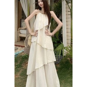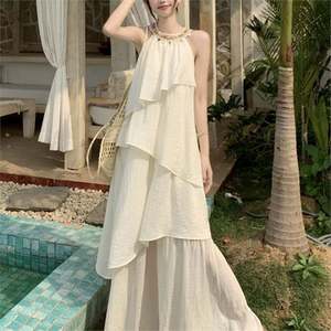 新款韩版绝美温柔风蛋糕长裙显瘦无袖挂脖连衣裙长裙女仙