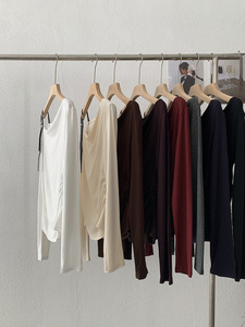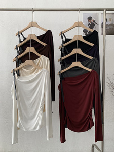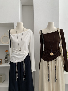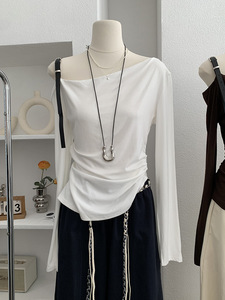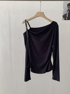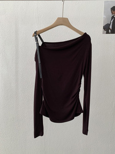 欧玛莱 皮带扣斜领收褶长袖T恤早秋收腰气质显瘦露肩修身上衣4489