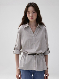芥末派VOOE设计V领收腰条纹宽松衬衫女早秋新款气质通勤上衣