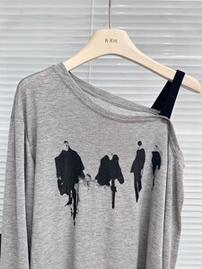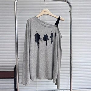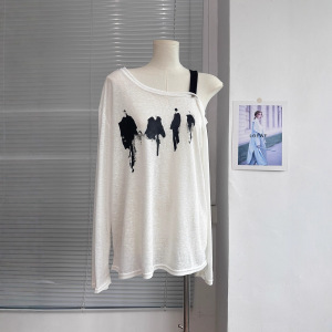 美式印花吊带斜肩长袖罩衫女夏季微胖mm大码宽松百搭防晒t恤上衣