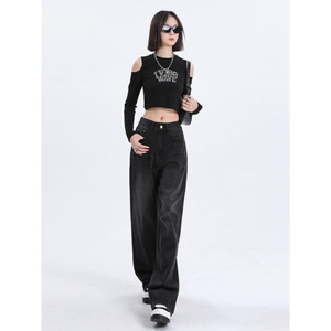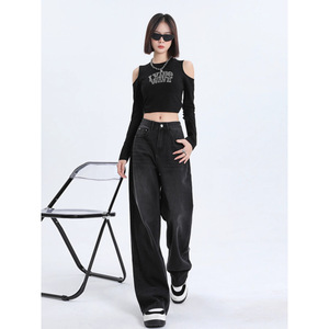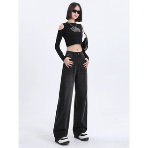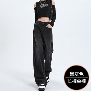 黑灰色阔腿牛仔裤女2025年新款秋季新款高腰直筒拖地裤子百搭显瘦