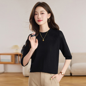 复古文艺针织衫2025春秋新款圆领宽松纯色螺纹七分袖打底衫上衣