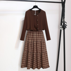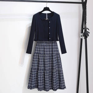 针织披肩开衫吊带格纹半身裙女三件套薄款2025秋装新款长袖连衣裙