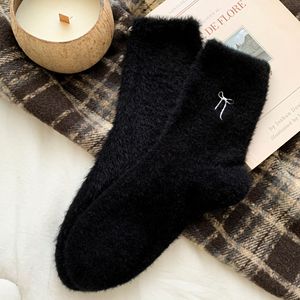 秋冬款咖色蝴蝶结刺绣女袜加绒加厚保暖袜居家地板中筒袜睡眠袜子