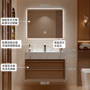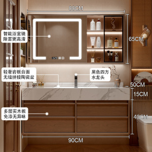 中古风岩板无缝陶瓷盆浴室柜洗漱台洗手脸盆防水防潮实木卫浴组合