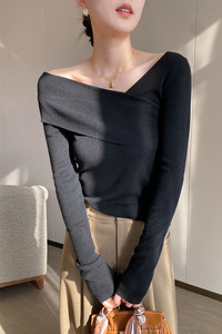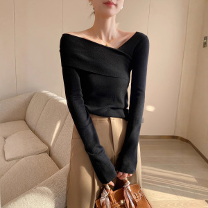 PINKEEN黑色一字领长袖针织衫女秋季2025新款慵懒风气质百搭毛衣