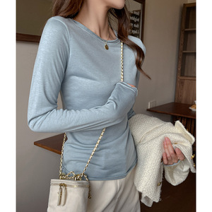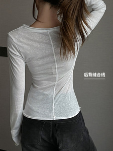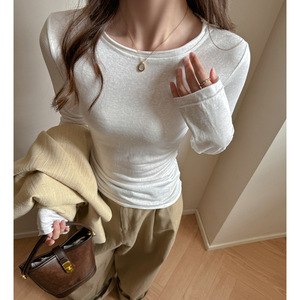 灰色美式圆领打底衫女内搭秋冬高级感正肩修身长袖t恤设计感上衣