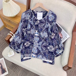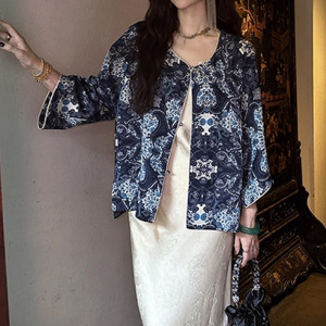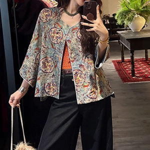 现货【珐琅彩】人丝斜襟金丝印花外套盘扣气质外套圆领上衣2025新