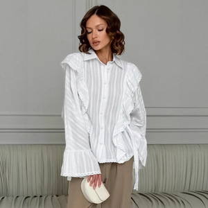 优雅时尚白色提花喇叭袖衬衫女2025秋季设计感宽松荷叶边上衣女装