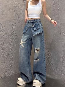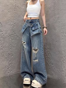 假两件破洞阔腿牛仔裤女2025夏秋新款时尚拼接前帘叠穿直筒拖地裤