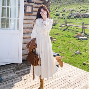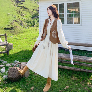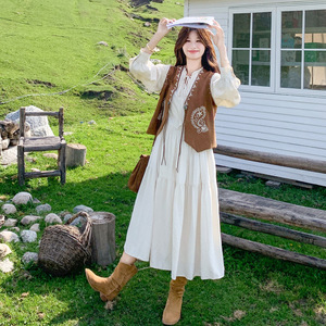 实拍米白色长袖连衣裙2025秋新款法式复古民族风马甲收腰长裙套装