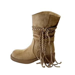 大码女鞋41-43复古废土风流苏骑士靴粗跟西部靴短筒显瘦堆堆靴女