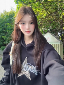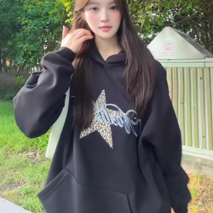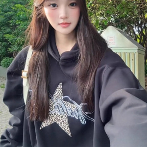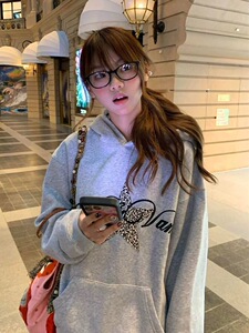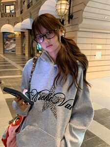 美式豹纹星星印花连帽卫衣女秋季新款宽松复古学院风灰色长袖上衣