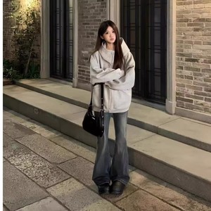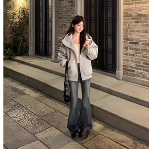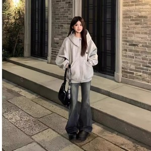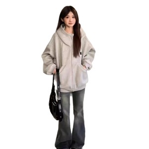 美式复古灰色高领连帽卫衣女宽松oversize慵懒风开衫学院风外套潮
