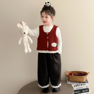 女童圆点花边毛线马甲三件套春秋款2025新款儿童韩版时尚女孩套装