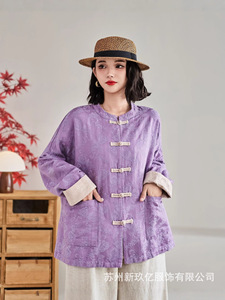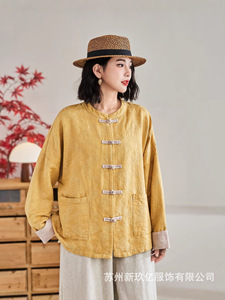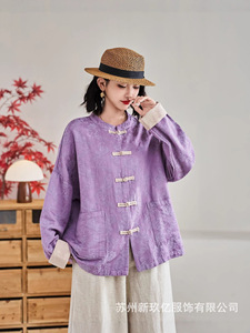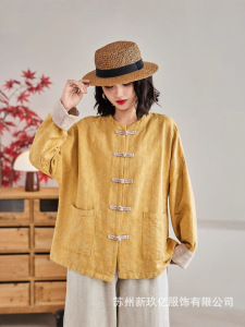 棉麻盘扣上衣女2025秋季中国风复古文艺对襟盘扣立领长袖衬衫外套